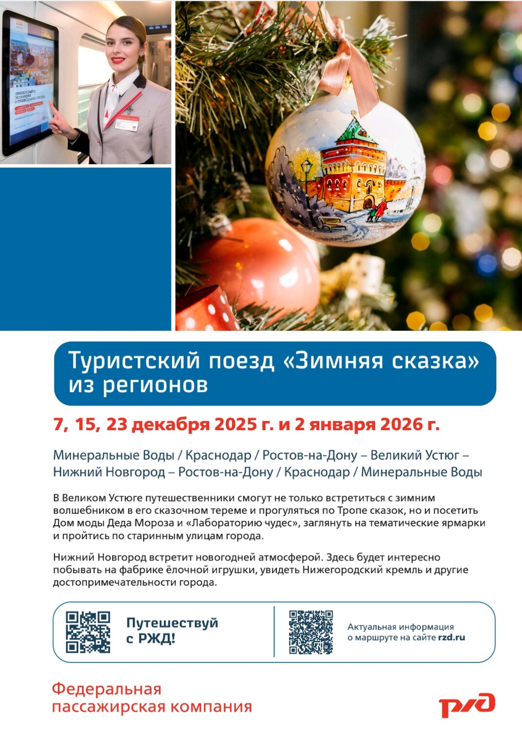 К празднованию Нового года и в целях расширения географии транспортной сети южных регионов России Северо-Кавказским филиалом АО «ФПК» впервые назначен туристский поезд «Зимняя сказка» из регионов» в Великий Устюг и Нижний Новгород.